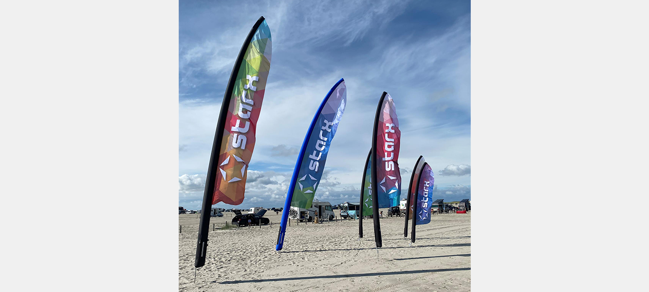 Starx Beachflags werden aus langlebigen, wetterfesten Materialien gefertigt und sind dadurch bestens für den Einsatz unter unterschiedlichsten Witterungsbedingungen geeignet. Die aufblasbare Eventfahne lässt sich individuell mit Ihrem Firmenlogo, Slogan oder Wunschmotiv bedrucken.